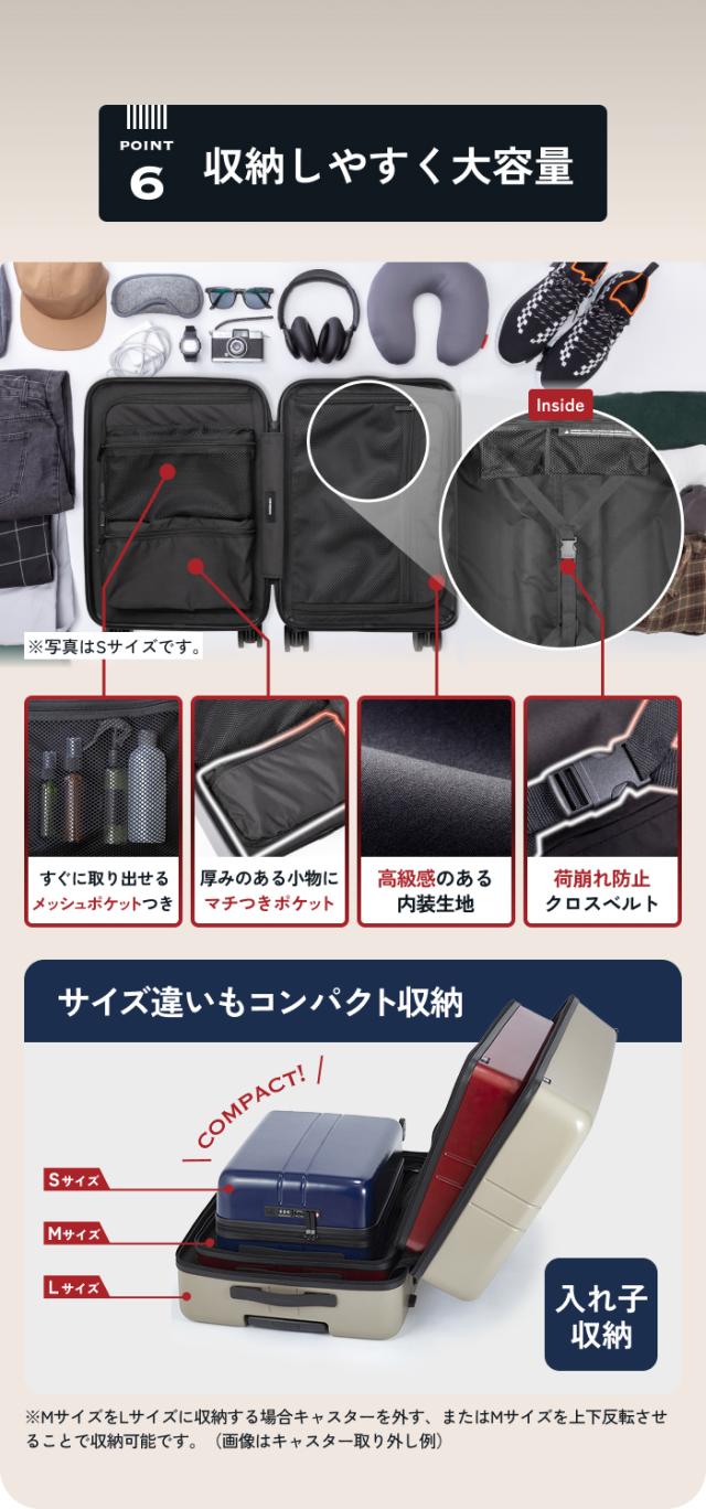 | ■スーツケースを航空機の貨物室に預け入れる際(チェックインする際)は、モバイルバッテリーを必ずスーツケース内から取り出し、機内へお持ち込みください。 ■バッテリー収納ポケットは以下の条件を満たすモバイルバッテリーが入るよう設計しております。 「長辺16cm以下 × 短辺8cm以下 × 厚み4cm以下、かつ三辺の合計が26cm以内」 ご使用予定のバッテリーサイズを予めご確認ください。 ■機内持ち込みサイズの規定は、各航空会社や航空機の座席数により異なる場合がございます。ご利用の航空会社の規定を事前にご確認ください。 ■ページ内の写真は、実際の色味に近くなるよう努めておりますが、ご使用の環境によって多少色味が異なって見える場合もございます。予めご了承ください。 ■製品の仕様、サイズ、価格等は予告なく変更することがございます。 ■本ページ記載のサイズ・数値等は全て参考値です。製造環境・使用環境によって多少の誤差が生じることもございますので予めご了承ください。 |
