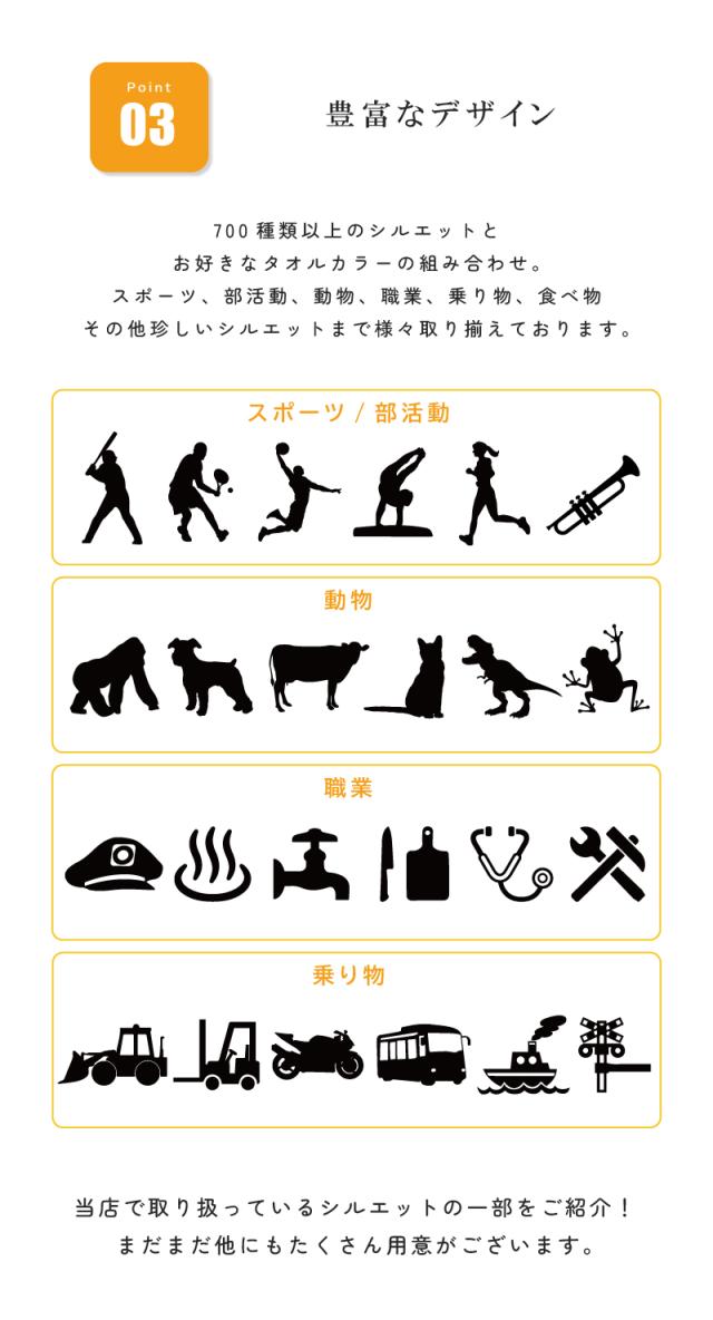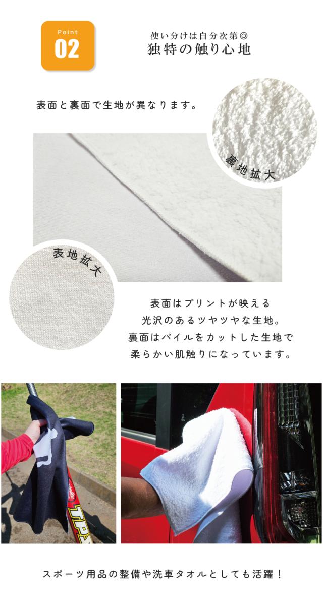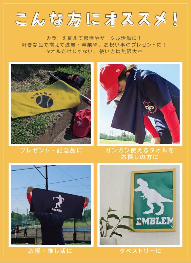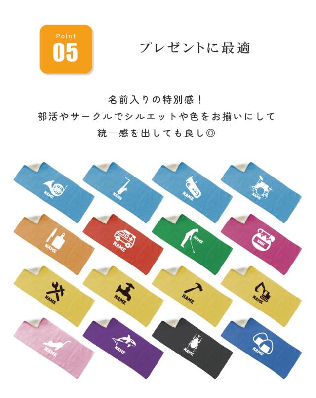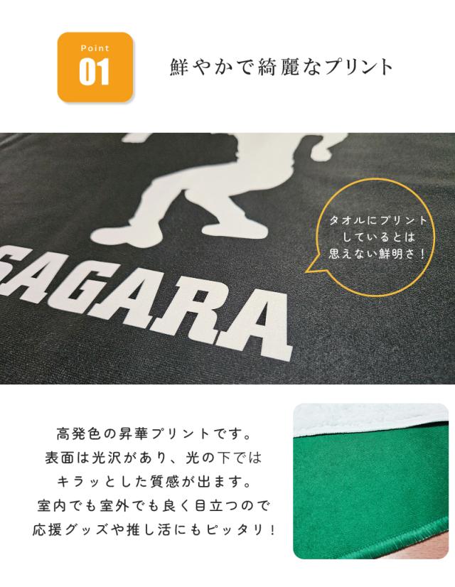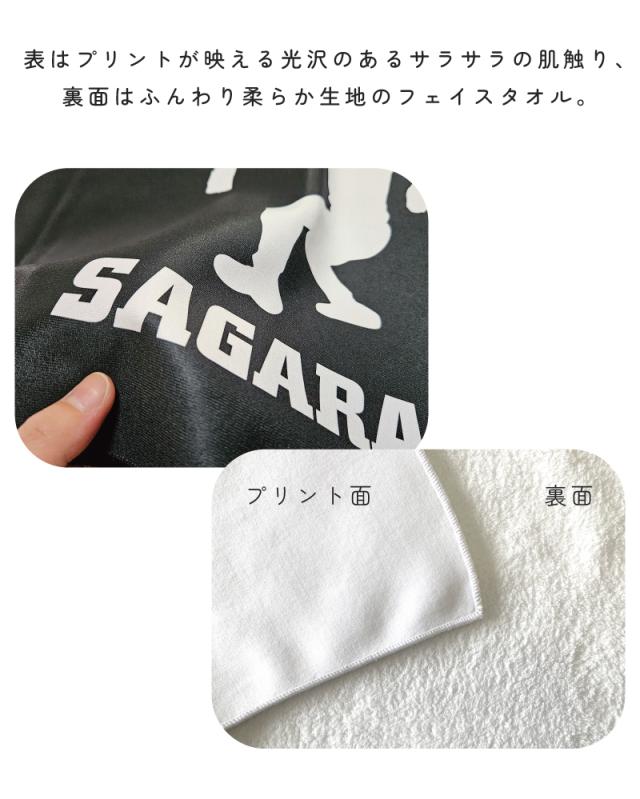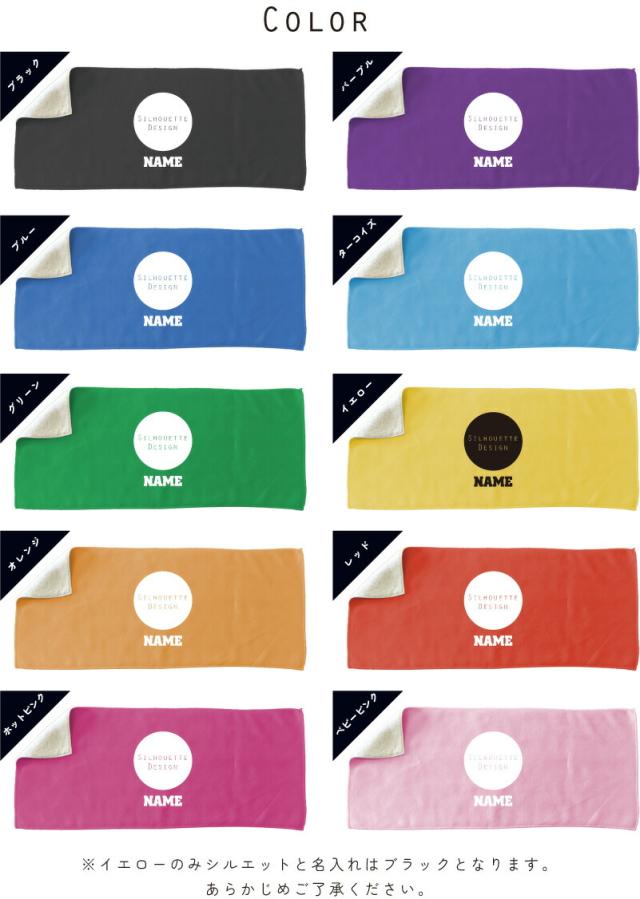 表はプリントが映えるサラサラの肌触りで、裏面はふんわり柔らか生地のフェイスタオル。推し色で推し活にも使える、豊富なカラーバリエーションは綺麗な発色で10色展開。正面にシルエット&お名前を入れた当店定番デザイン。運動会や部活などの応援にはもちろん、吸水力も抜群で選手やお子さんも使い勝手よし。誕生日、記念日などの記念品、父の日母の日敬老の日などのギフトシーンでもオンワリーワンなアイテムとして活躍間違いなし。部活やクラブ活動、少年団やサークル、スポーツチームなどの卒部記念品、卒業記念品、卒団記念品、贈答品にも選ばれます。贈って嬉しいもらって嬉しいギフトアイテムです。