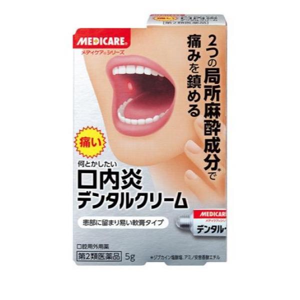 ◆ムシ歯は,歯に付着した食べかすが口中の細菌によって分解されて歯垢となり,歯の表面のエナメル質を破壊し,さらにムシ歯の細菌が,歯髄に感染して化膿を起こす病気で激しい痛みを伴います。◆デンタルクリームは,口腔内の痛みを速やかに鎮め,化膿を防ぐ4種の成分を,効果的に配合した医薬品です。〔ノーエチ薬品(株)販売より〕●口内炎とは…口の粘膜にできる小さな潰瘍(粘膜表面の細胞が壊れてできる穴)で,死んだ細胞などのために,見た目は白っぽく見えます。また,患部は痛くてしみるので,食事や会話など日常生活でも支障をきたすことが多いです。●口内炎の原因は…口の粘膜を噛んだり,傷つけてしまったり,ストレスや疲れ・睡眠不足,ドライマウスなどがあります。●口内炎を予防するには…栄養バランスのとれた食事や規則正しい生活の他,口の中の乾燥を防いだり,うがい・歯磨きなどによって口の中を清潔に保つことなども重要です。●デンタルクリームは局所麻酔成分(ジブカイン塩酸塩,アミノ安息香酸エチル)が痛みに直接働きかけ,殺菌成分(塩化セチルピリジニウム)が原因菌を殺菌し,消炎成分(l-メントール)が患部の炎症をやわらげる軟膏タイプの医薬品です。口腔内の