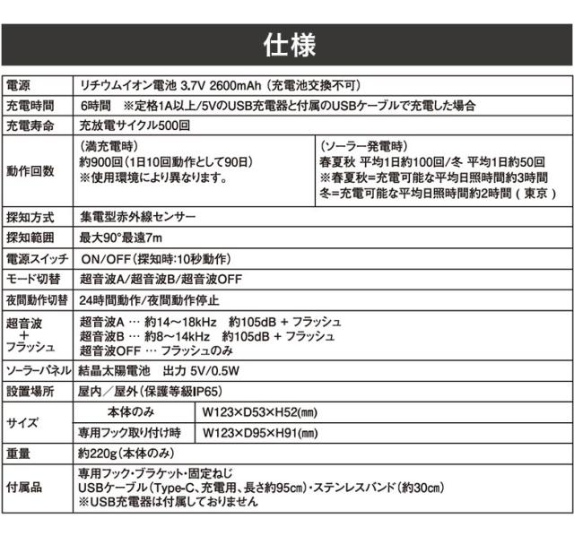 超音波A … 約14〜18kHz 約105dB+フラッシュ