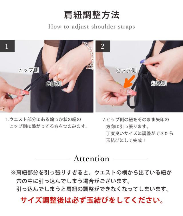 ※肩紐部分を引っ張りすぎると、ウエストの横から出ている紐が穴の中に引っ込んでしまう場合がございます。