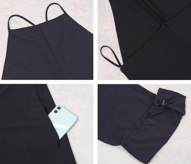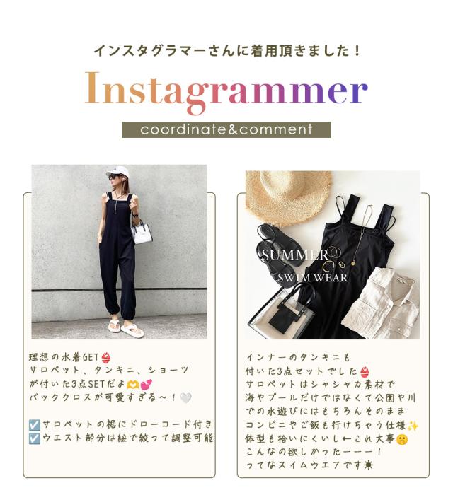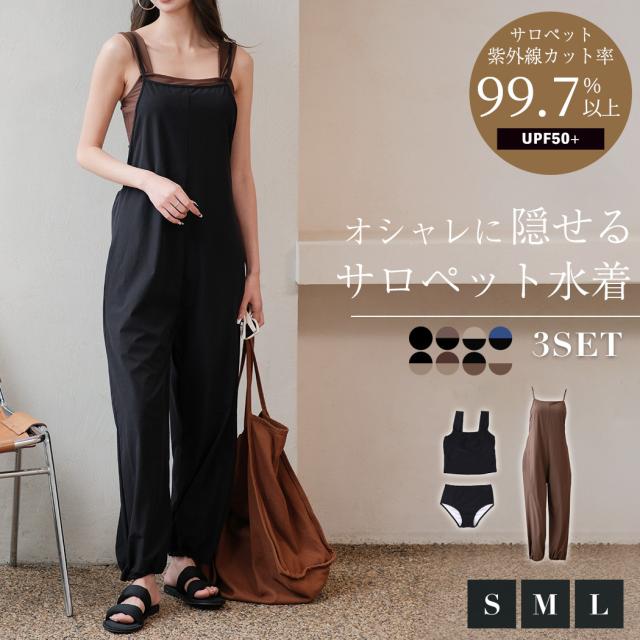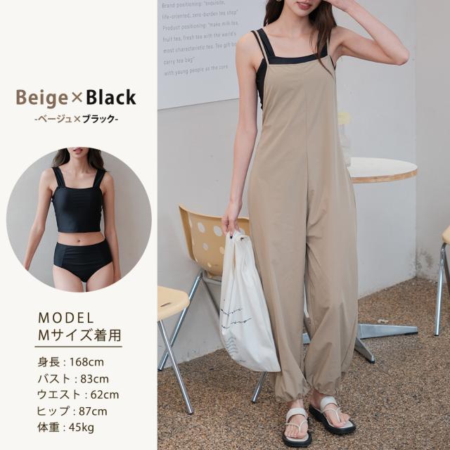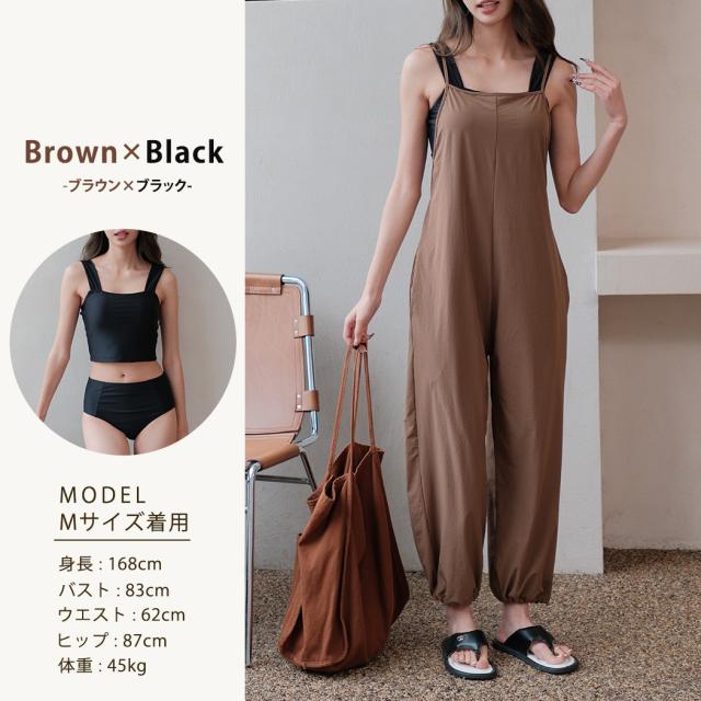 タンキニ水着 レディース 体型カバー水着 ラッシュガード 素材 キャミソール サロペット 3点セット おしゃれ パッド付き スポーティ 黒 ポケット ドローコード ウエスト ヒップ 太もも 脚 カバーアップ UVカット 紫外線対策 接触冷感 UPF50+ ママ水着