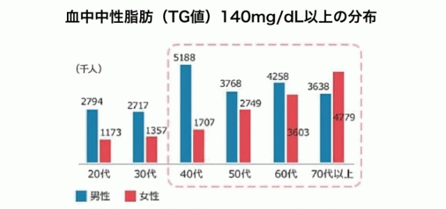 男女ともに20代、30代と比べて40代以上で血中中性脂肪(TG値)140mg/dL以上の方が多くなっています。