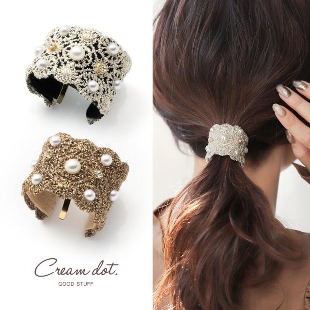 ゴールドラメ入りの繊細な刺繍にパールとビジューを配した華やかなポニーフック。ワイヤー入りなので、スタイルに合わせてカーブラインが調節できます。デコラティブなデザインで、コーデのアクセントやオケージョンシーンにも◎