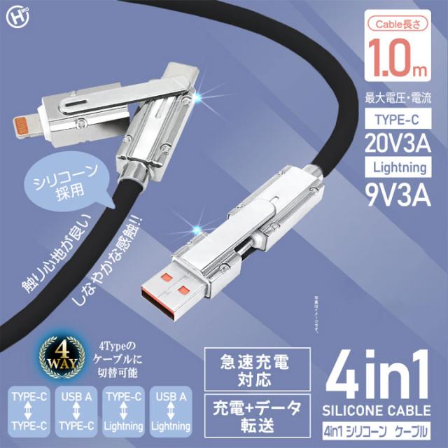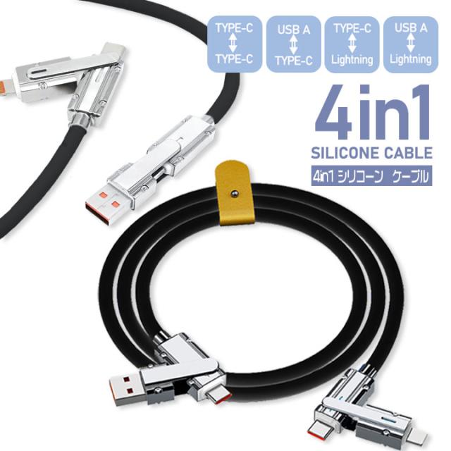 4in1シリコンケーブル 1m ブラック 充電 データ転送 急速充電対応 絡みにくいシリコン Type-C Lightning メール便送料無料