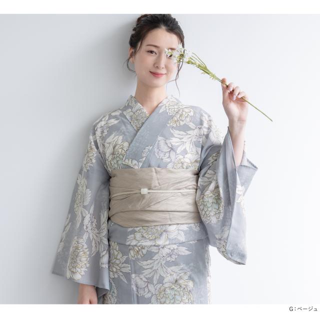 光の加減で糸がラメのように輝く生地は独自の織り方で、単色の飽きのこない波文様のデザインですので、着物の色柄を問わずコーディネートしやすいのが魅力です。