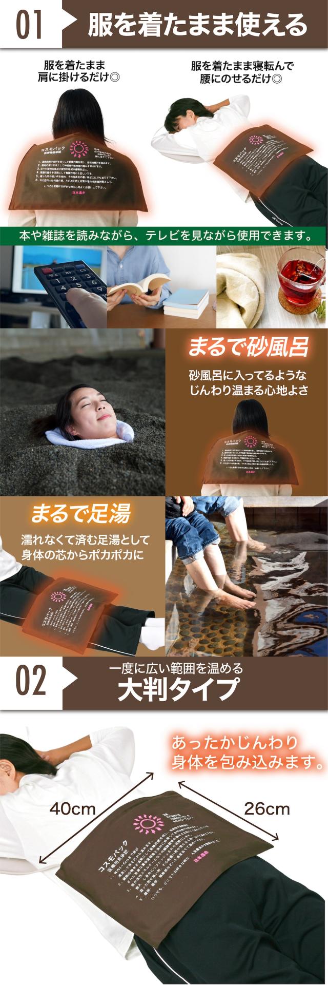 服を着たままで砂風呂と同様の温熱効果が期待できる温熱パックです。