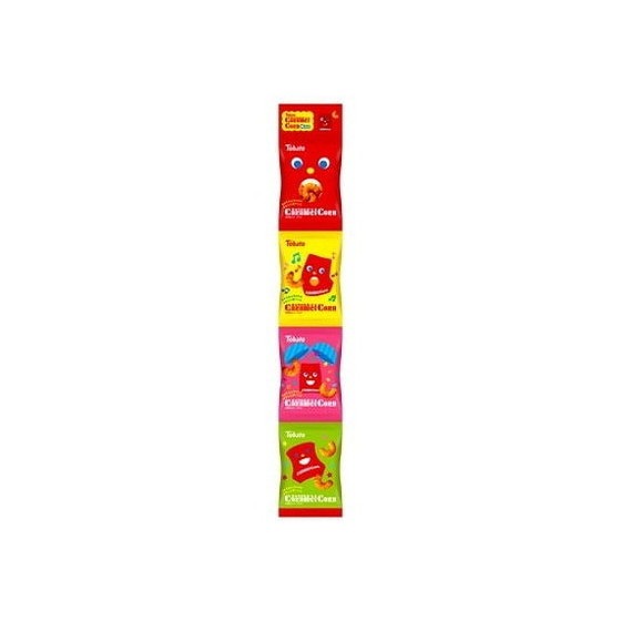 ふんわりサクサク、口の中ですうっととろけるキャラメルコーン。キャラメル感を上げ、甘みを抑えで連食性をアップしました。小分けにして食べられる4連包です。
