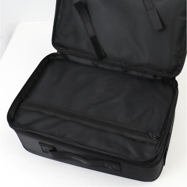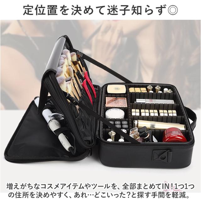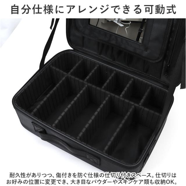 | 商品説明 | ・メイクアイテムがまとまる大容量サイズ♪ポケットや仕切り付きで整理整頓ラクラク!「メイクボックス」が新登場。 【定位置を決めて迷子知らず◎】 ・増えがちなコスメアイテムやツールを、全部まとめてIN!1つ1つの住所を決めやすく、あれ…どこいった?と探す手間を軽減。 【たっぷり入る2スペース仕様】 ・収納力がアップする2スペースタイプ。使いやすく仕分けできるのが嬉しい! 【ガバっと開いて出し入れスムーズ】 ・2スペースともに、左右どちらからも開くダブルファスナーで180度オープン。使いたいアイテムが一目瞭然◎ 【自分仕様にアレンジできる可動式】 ・耐久性がありつつ、傷付きを防ぐ仕様の仕切り付きスペース。仕切りはお好みの位置に変更でき、ちょこっと大きなパウダーやスキンケア類も収納OK。 【ブラシなどのツールもすっきり】 ・フタ裏12個のギャザーポケットには、ブラシ類を収納。面ファスナー式のフラップでこぼれ落ちや汚れをガード。小物が入るファスナーポケットも装備。 【サポートベルトでしっかりキープ】 ・両サイドのバックル式ベルトを、お好みの長さに調節。フタを開いた状態を保持できて便利。 【ドレッサーのように使えるミラー】 ・ブラシ収納部分のフラップ表面にはミラーを♪簡易的なドレッサー代わりになり、メイクもスムーズ。 【コテなどヘアグッズも一緒に収納】 ・サブルームに装備された面ファスナーベルトで、コテやヘアアイロンを固定。ファスナー式メッシュポケットも付いており、コスメと分けたいアイテムを収納。 【持ち運びがスマート&安心設計】 ・上部に持ち手が付いており、移動や持ち運びも簡単。安定感ばっちりなボックス型&クッション材入りで衝撃を和らげて中身を保護。 【肩掛けもキャリーオンも自在】 ・長さ調節できるショルダーベルトを取り付けて、肩掛け。背面のベルトをキャリーケースのバーに通すこともでき、プロのメイクさんにもおすすめ。 【長く愛用できるシンプルなつくり】 ・使う人を選ばず飽きのこない、シンプルなブラックカラー。抜群の収納力で、大切に保管&持ち運びできる便利アイテム。 |