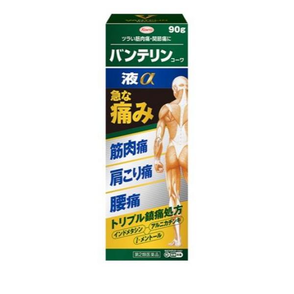 バンテリンコーワ液αは,筋肉や関節の痛みをとるトリプル鎮痛成分(インドメタシン,l-メントール,アルニカチンキ)を配合した局所浸透薬です。本剤を肩,腰,ひじ,ひざ,手足などの痛みのある部位に塗布しますと,痛みの患部に心地よいメントールの清涼感とともに,効きめの成分が次々と浸透して,痛みを患部からジカにとってくれます。本剤は,さっと乾きやすくて,ベタつきが少なく,肩,腰などの広い範囲から有毛部位などの塗りにくい範囲まで,様々な部位に使いやすい液剤です。また,痛みの患部に直接塗れるスポンジ容器を採用し,手を汚さずに手軽に使えます。