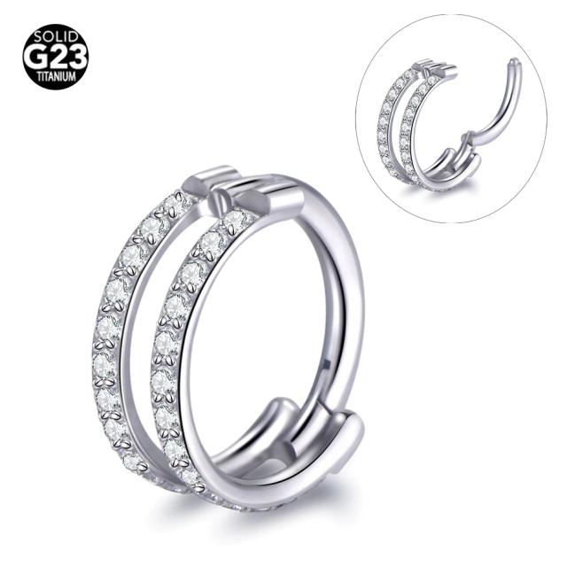 [16G チタングレード23 ボディピアス] G23チタン製ダブルラインジルコニアクリッカー 16ゲージ セグメント コンク ダイス ロック 軟骨 耳 鼻シルバー 銀色 メンズ レディース リング型 ワンタッチ 男性 女性 2連風 ストーン クリスタル キュービックジルコニア キラキラ
