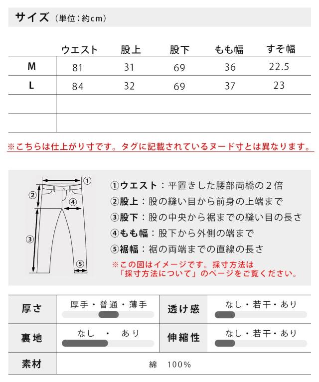 L : ウエスト84cm 股上32cm 股下69cm もも幅37cm 裾幅23cm