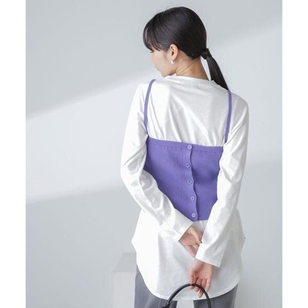 3WAYで着用できるニットビスチェとシンプルなロングスリーブカットソーのセットアイテム。ボタンをフロントやバックにしたり、肩紐を中側に垂らして肩紐なしのアレンジなど、さまざまな着回しが楽しめる万能デザイン。セットではもちろん、お手持ちのアイテムとのコーディネートも楽しめるデイリーに活躍するアイテムです!