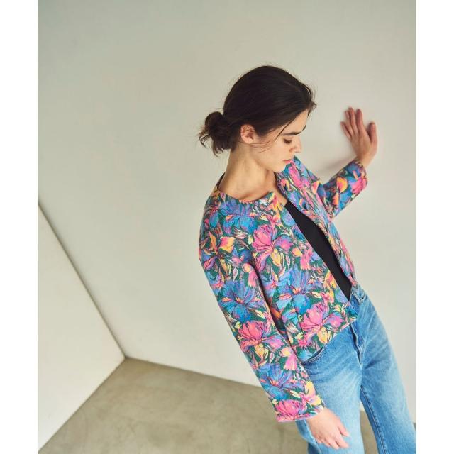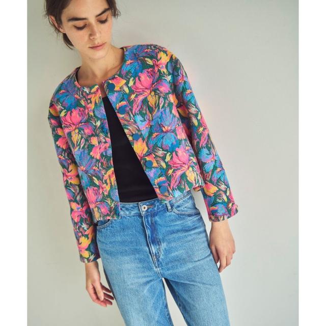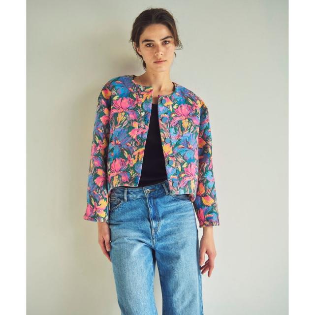 インポートならではの大胆な柄とカラーで魅せる、春のノーカラージャケット。