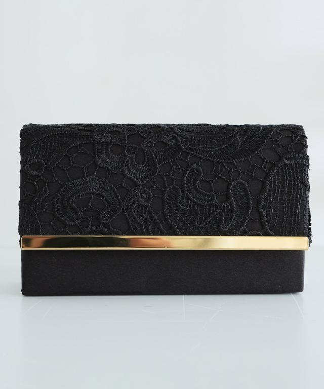 サテンレースとメタルパーツのミニクラッチバッグ。今流行りのコンパクトデザインです。フラップ部分の光るメタルフレームが洗練された大人の印象を与えます。