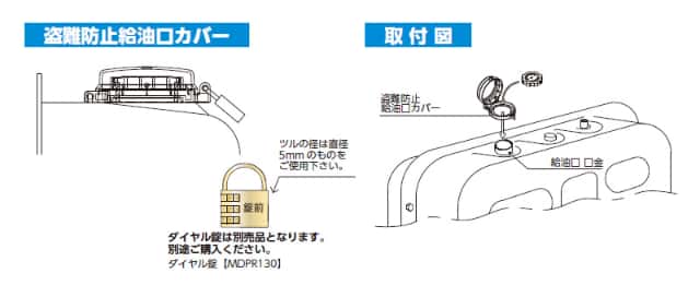 - 給油口に錠前を付けて盗難防止できるカバー付き。
