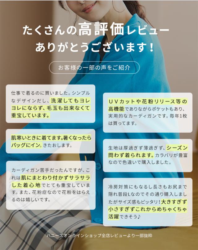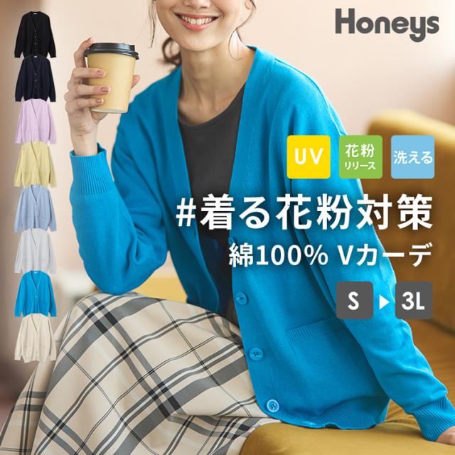 トップス カーディガン レディース 黒 長袖 羽織 UVカット 花粉リリース加工 大きいサイズ Honeys ハニーズ 花粉対策Vネックカーデ