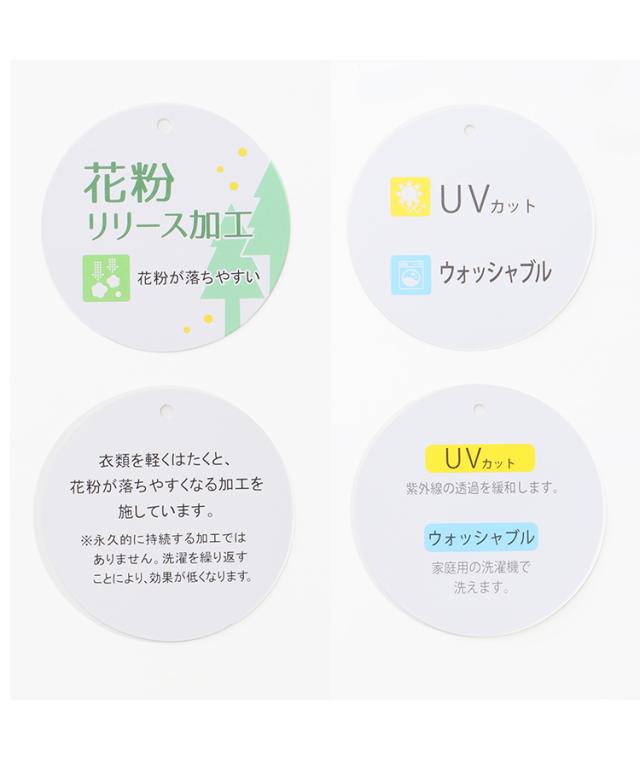 紫外線対策の『UVカット』、家庭用の洗濯機で洗える『ウォッシャブル』に、軽くはたくと花粉が落ちやすくなる『花粉リリース加工』もプラスし機能性抜群。