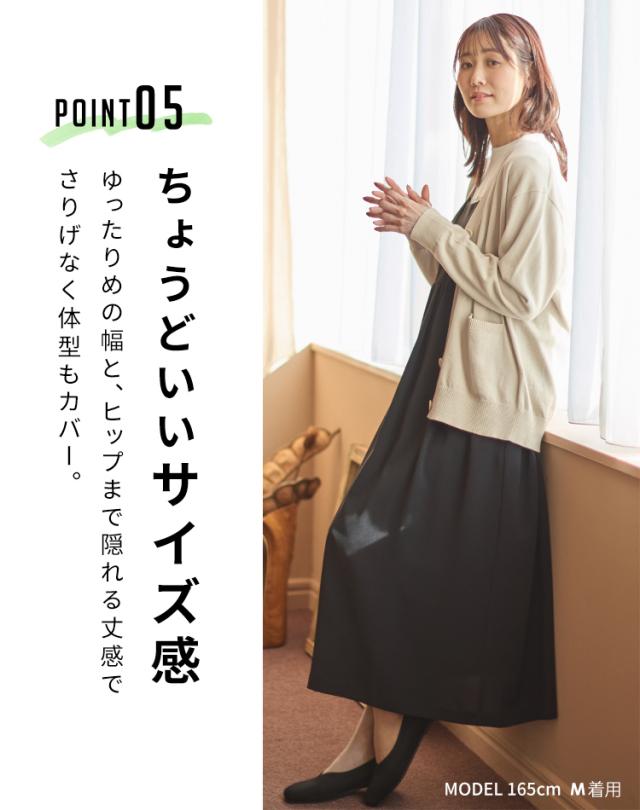 ゆったりめの幅とヒップまで隠れる丈感で体型もカバー。