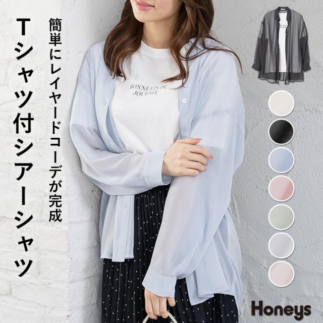 シャツ ブラウス 長袖 シアー Tシャツ セット 羽織り 白 黒 ブルー レディース Honeys ハニーズ Tシャツ付シアーシャツ