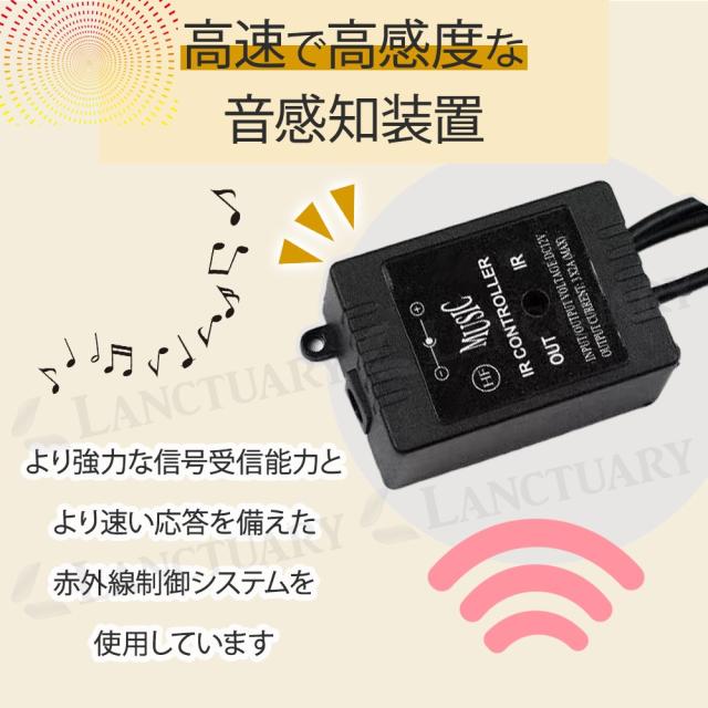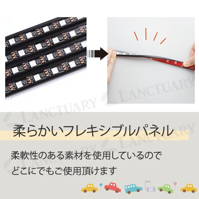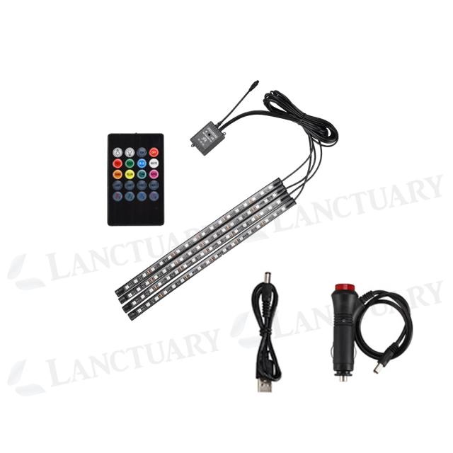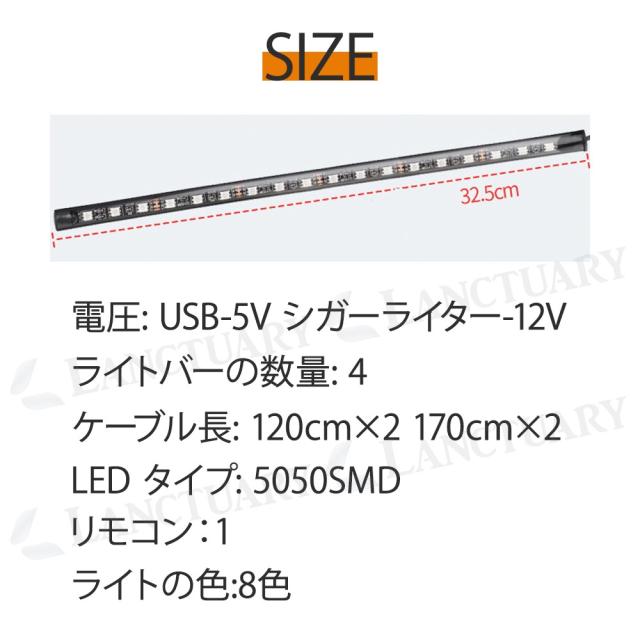 | 主な仕様 | 電圧: USB-5V シガーライター-12V ライトバーの数量: 4 ケーブル長: 120cm×2 170cm×2 LED タイプ: 5050SMD リモコン:1 ライトの色:8色 |