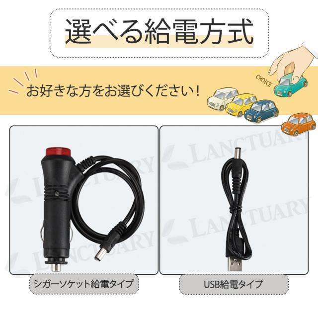 シガーソケット給電方式かUSB給電方式かお好きな方をお選び頂けます。