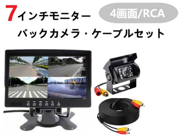 送料無料 7インチ4分割モニター バックカメラ ケーブルセット 12V/24V兼用 4画面 RCA オンダッシュモニター 車載モニター 4画面同時表示対応 20mケーブル バス トラック 重機 防水 暗視 LEDカメラ