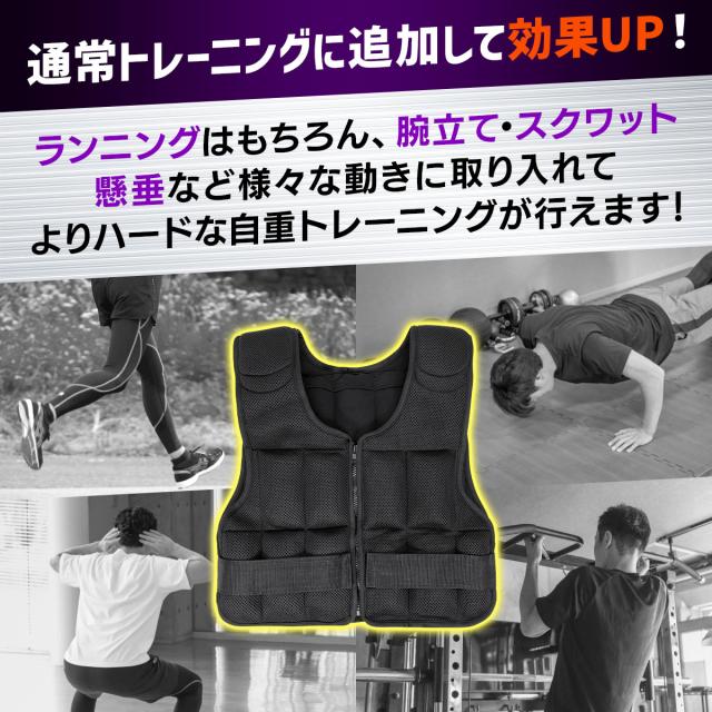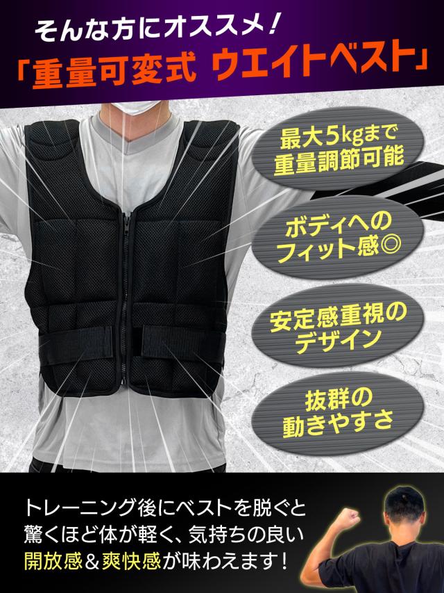 【重量を調節できるウエイトベスト】自重で足りなくなった方や、効率よくトレーニングしたい方にオススメなウエイトベスト!多くのウエイトベストが10kgから始まりますが、当商品はベストのみの重さから始められ、可動域を邪魔しないシンプルなデザインなので初心者にもオススメのウエイトベストになっております。