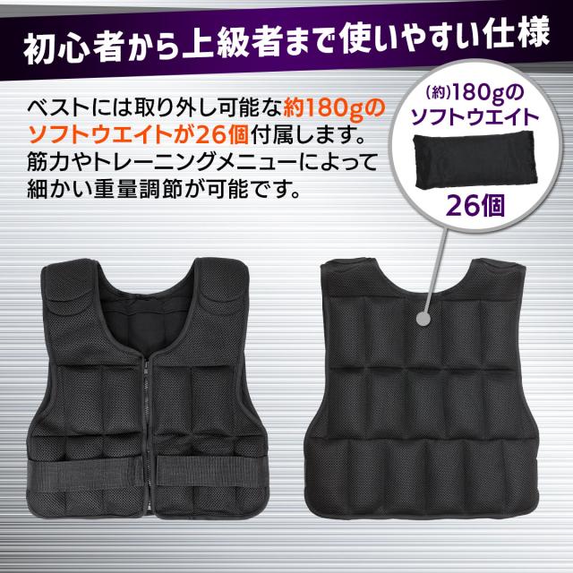 【細かい重量調整が出来る】1つ180gのソフトウエイトが本体ベストの前後に26個取り付けられるので、ベストのみ320g〜5kgまで細かい調整が可能!初心者の方はまずベストのみから始め、筋力や体力に合わせて調節してお使いください。また、重りを増やすときは前後バランスよく取り付けることを推奨します。