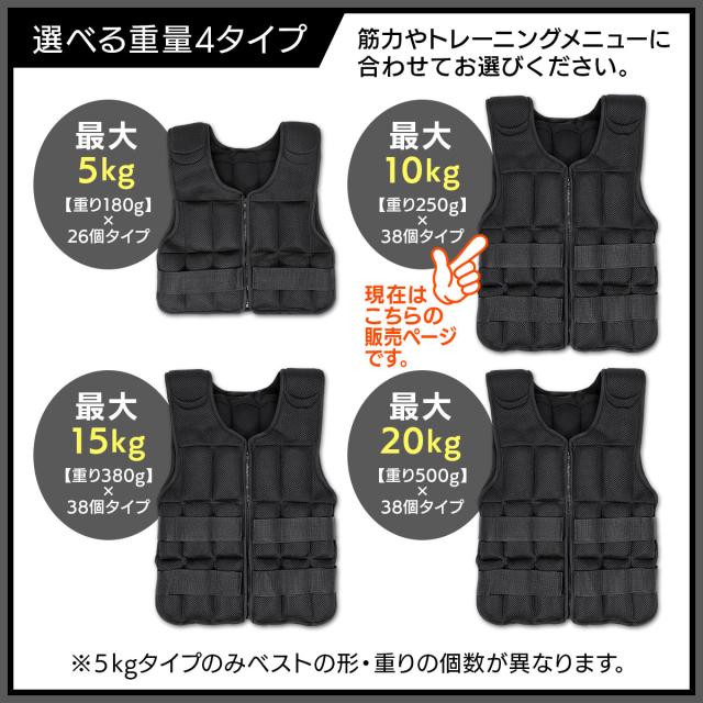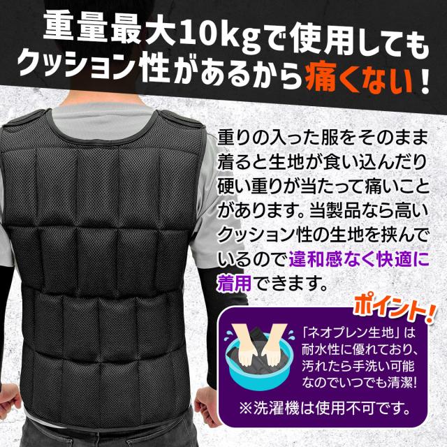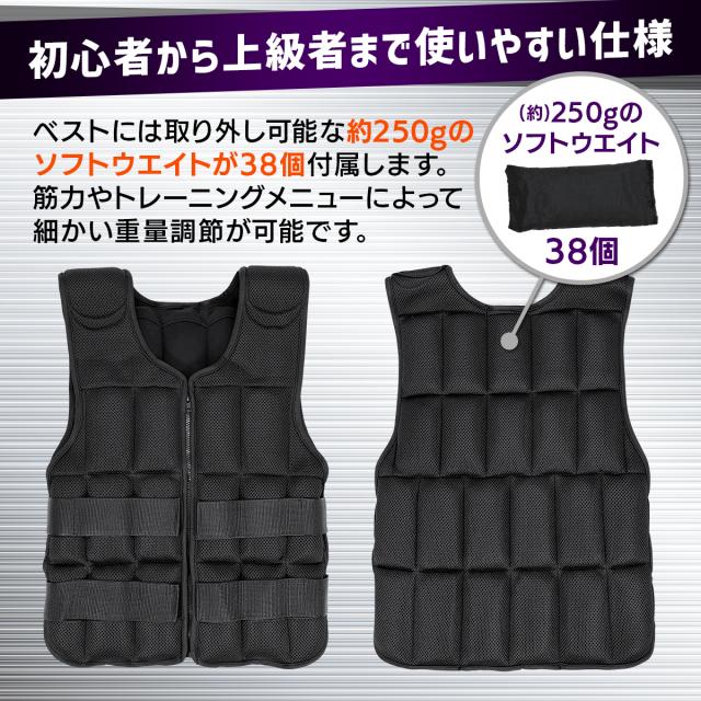 【細かい重量調整が出来る】1つ250gのソフトウエイトが本体ベストの前後に38個取り付けられるので、ベストのみ500g〜10kgまで細かい調整が可能!初心者の方はまずベストのみから始め、筋力や体力に合わせて調節してお使いください。また、重りを増やすときは前後バランスよく取り付けることを推奨します。