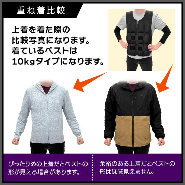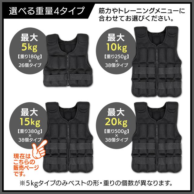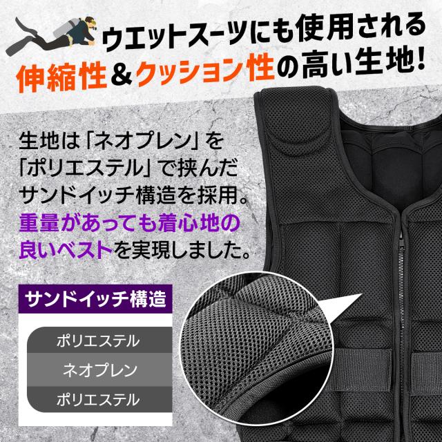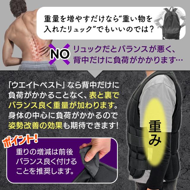【細かい重量調整が出来る】1つ380gのソフトウエイトが本体ベストの前後に38個取り付けられるので、ベストのみ560g〜15kgまで細かい調整が可能!初心者の方はまずベストのみから始め、筋力や体力に合わせて調節してお使いください。また、重りを増やすときは前後バランスよく取り付けることを推奨します。