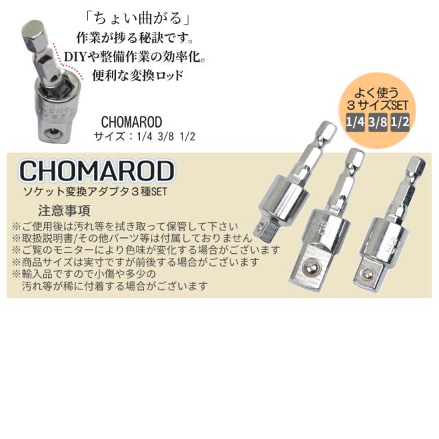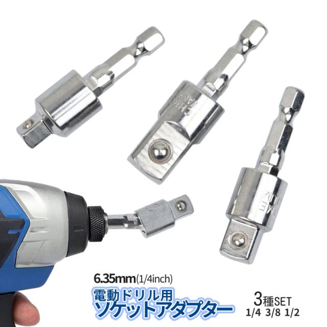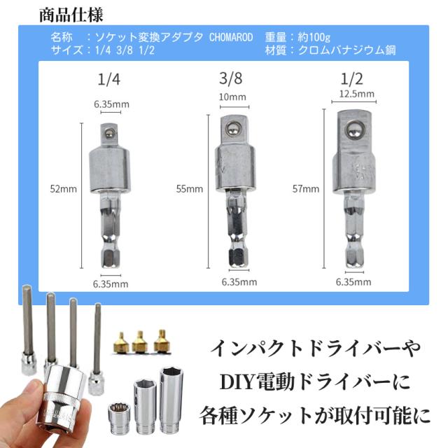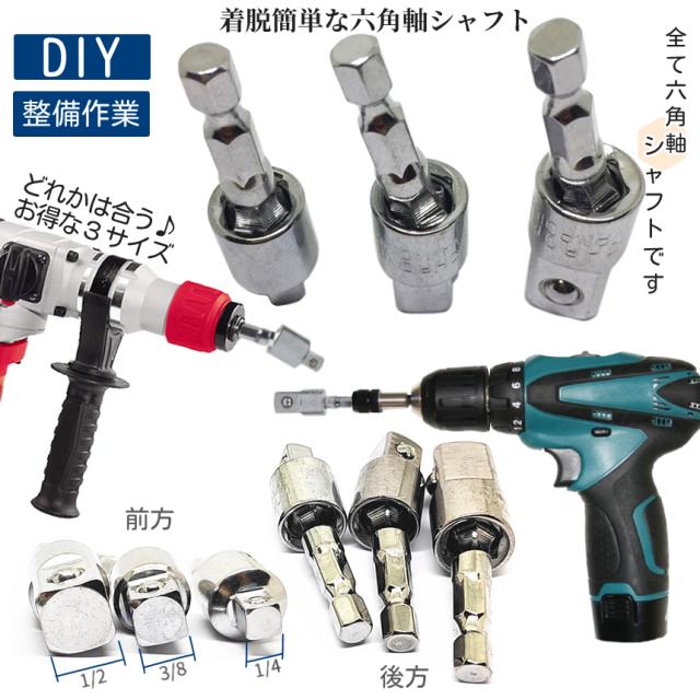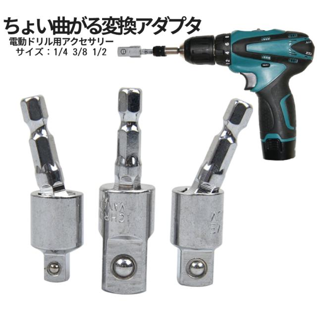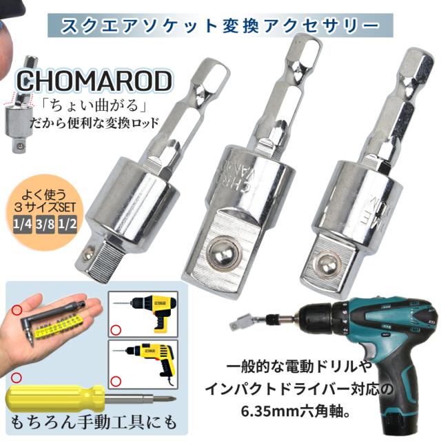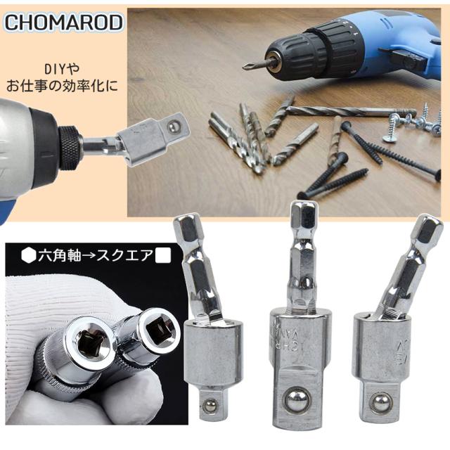 ソケットアダプター ちょっと曲がる 3本セット 3サイズ 1/4 3/8 1/2 ソケット 変換 スクエアソケット 電動ドライバー インパクト 6.35mm 六角軸 曲がるソケット シルバー アダプタ 工具 DIY 便利 CHOMAROD 送料無料