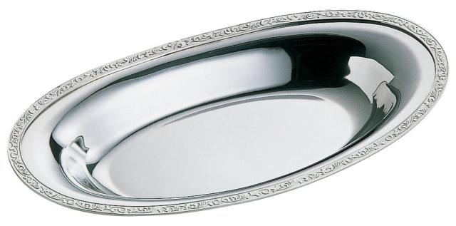 カレーやパスタ、シチューやチャーハン等の盛り付けに。メインディッシュに活躍するのはもちろんですが、サラダ等を盛り付けて大皿としてお使いになるのも良いですね。楕円型なので、大きめサイズでもテーブルへの収まりがいいです。 渕にはゴージャスな模様が入っています。その模様とシルバーの輝きで高級感があります。 ステンレス製だからもちろんお手入れも簡単です。シンプルながらも非常に洗練された造りで、飽きさせず、丈夫で長くご利用できる製品です。