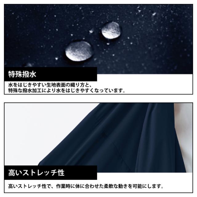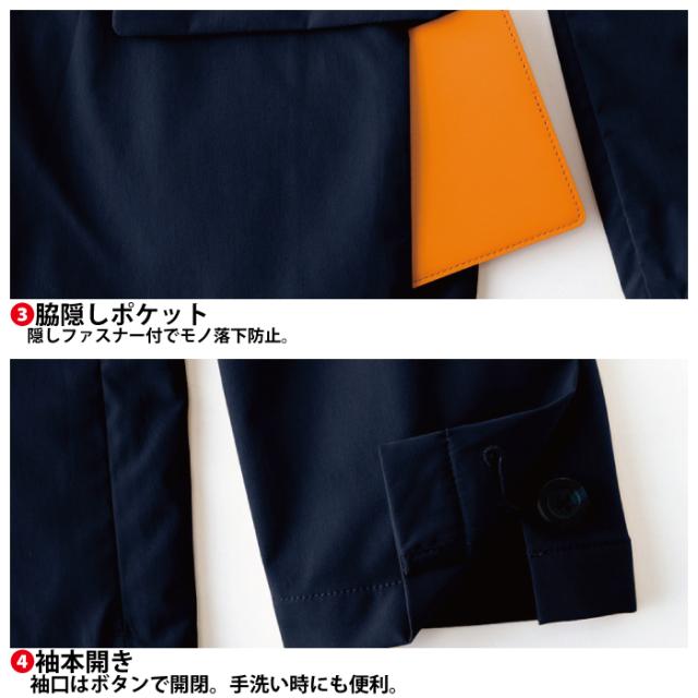 ◇機能:撥水・大型スマホも入る口幅11センチポケット・ファスナー付きでもの落下防止の胸ポケット・脇部分には隠しファスナー付きでモノ落下防止ポケット・袖口はボタンで開閉。手洗い時にも便利。左胸・右胸の両玉内ポケット。右裾ファスナー付き大型ポケット