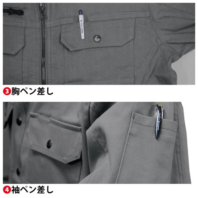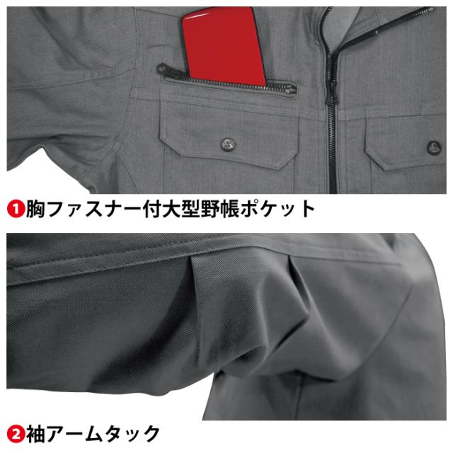 ◇機能:スーパーストレッチ・タテムラ糸・カジュアルスタイル・胸ファスナー付き大型野帳ポケット・袖アームタック・胸ペン差し・袖ペン差し