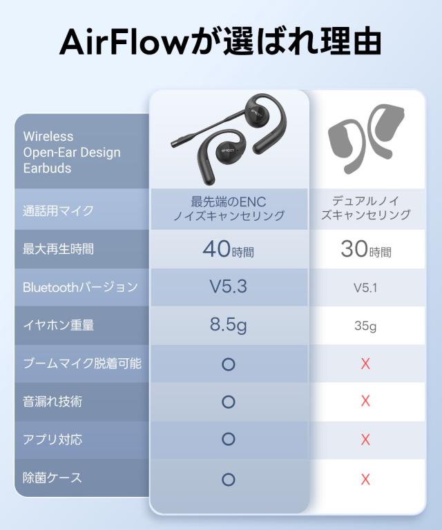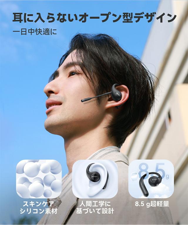 片耳わずか8.5gの軽量設計を採用したAirFlowは、装着中も快適な使用を実現します。また、柔らかくて肌に優しい素材と超薄型形状記憶チタン製のフレームにより、メガネやマスクを着用していても快適性を維持します。