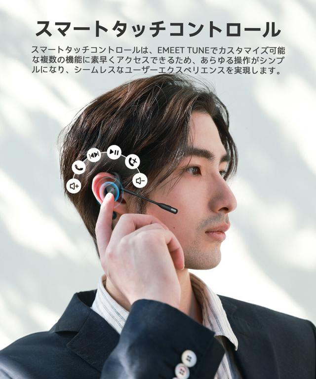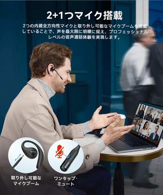 eMeet AirFlowは、快適な装着感と高い通話品質を両立したワイヤレスヘッドセットです。軽量設計と通気性に配慮したイヤーパッドにより、長時間使用しても蒸れにくく、在宅勤務やオフィスワークでも快適に使用できます。