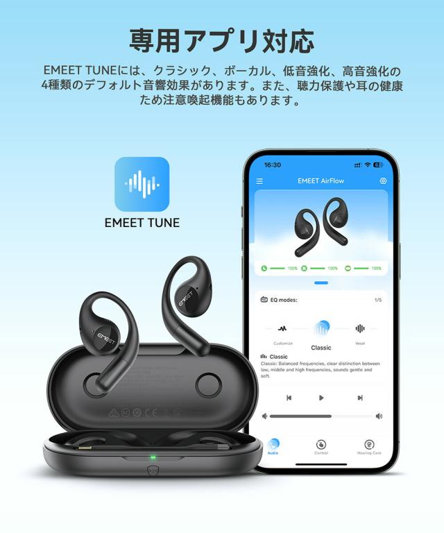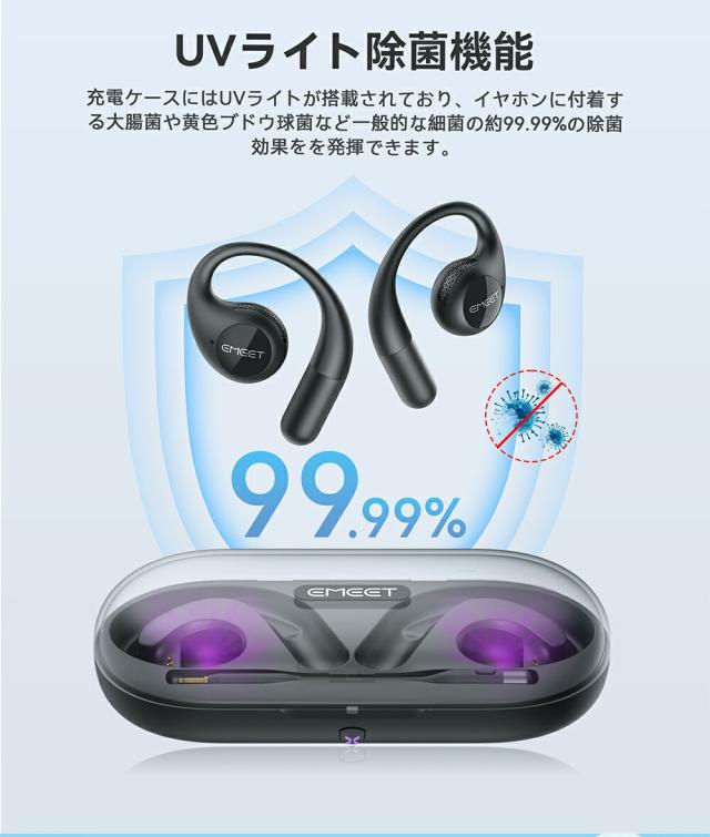充電ケースに搭載されたUVライトは、イヤホンに付着する細菌の除菌効果を高め、着用時の清潔さを保ちます。また、EMEET TUNEアプリの聴力保護リマインダー機能は、耳の健康を守ります。