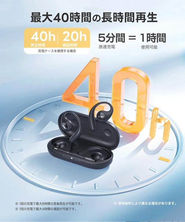 充電ケースには最大40時間の再生時間を提供し、AirFlowはフル充電1回あたり最大8時間の再生時間を実現します。バッテリの不安から解放され、長時間の使用にも対応します。
