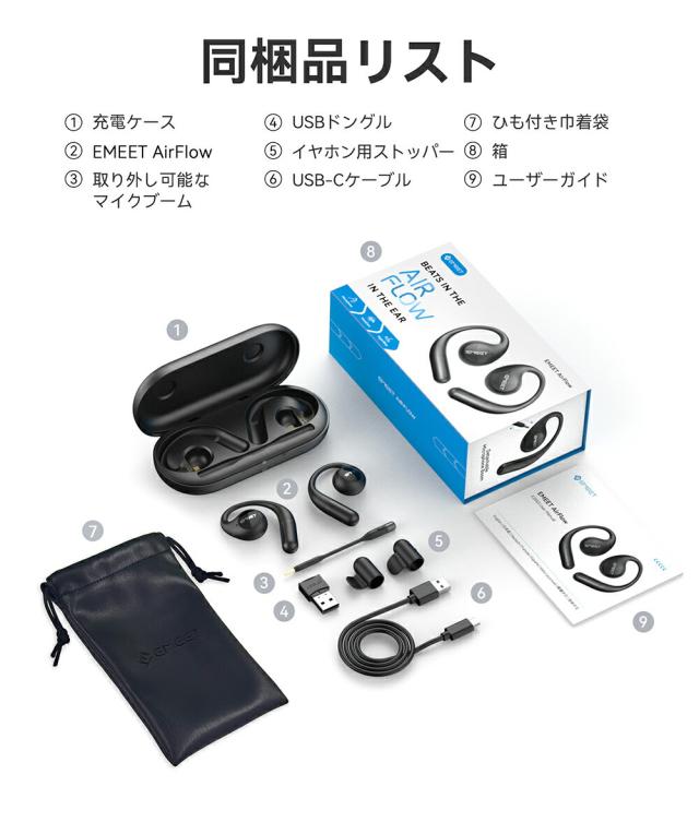 | パッケージ内容 | Airflow本体 充電ケース USBドングル 収納用袋 イヤホンストッパー 取り外し可能マイクブーム USBーC充電ケーブル 取扱説明書 |