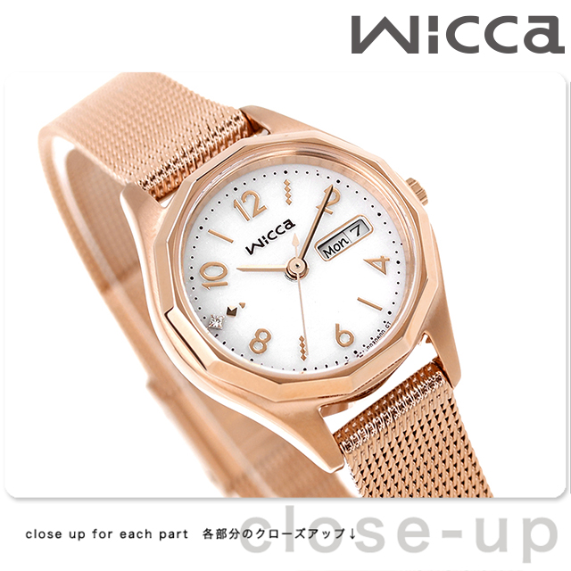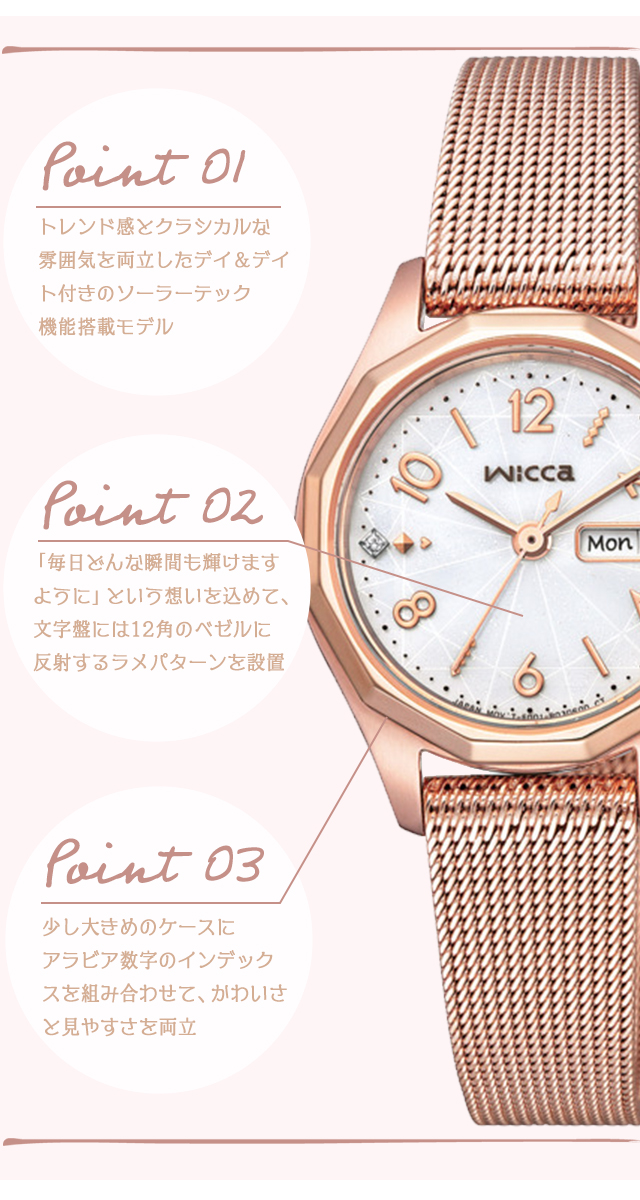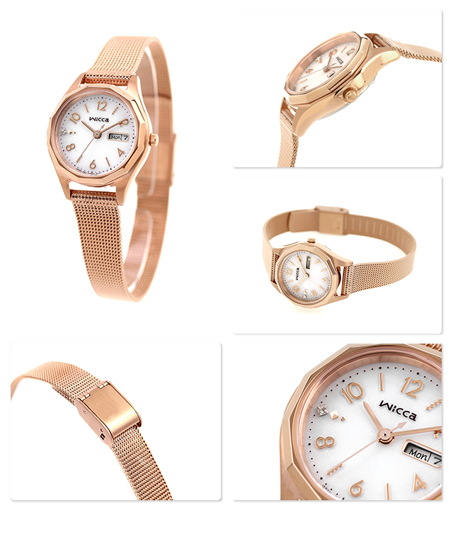 正規品 7年保証キャンペーン 送料無料 シチズン ウィッカ ソーラーテック デイ&デイトモデル レディース 腕時計 KH3-568-15 CITIZEN wicca アナログ シルバー ピンクゴールド ◆12角形ベゼルが人気を集めるデイ&デイト付きシリーズに、メッシュバンドモデルが登場。カジュアルなファッションにも、フェミニンなファッションにも合わせやすいデザインです。フェミニンなピンクゴールドの2タイプ。ご自身で簡単に長さ調節ができる仕様です。シンプルなデザインはシーンを問わずお使いいただけ、誕生日や記念日などのプレゼントにもおすすめです。 発売日:2024年2月発売