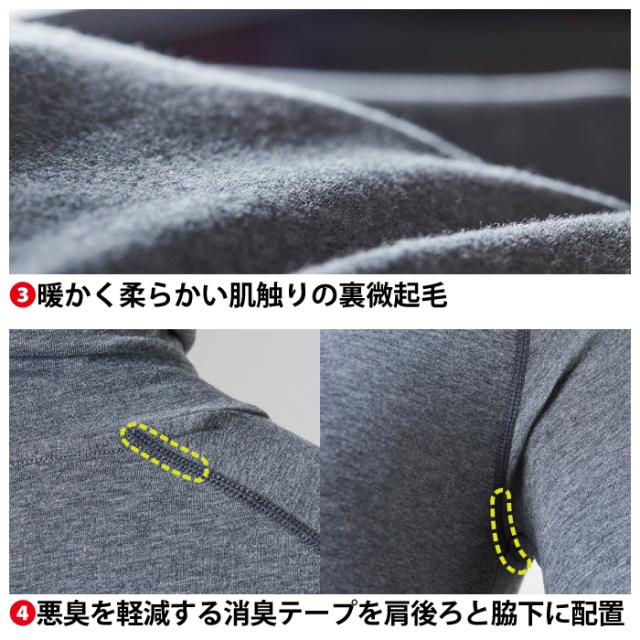 ◇機能:フリーストレッチ・消臭・UVカット・裏微起毛・肌触りの良いフラットシーム加工・伸縮性に優れたフリーストレッチ素材・暖かく柔らかい肌触りの裏微起毛・悪臭を軽減する消臭テープを肩後ろと脇下に配置・首元まで暖かいタートルネックタイプ