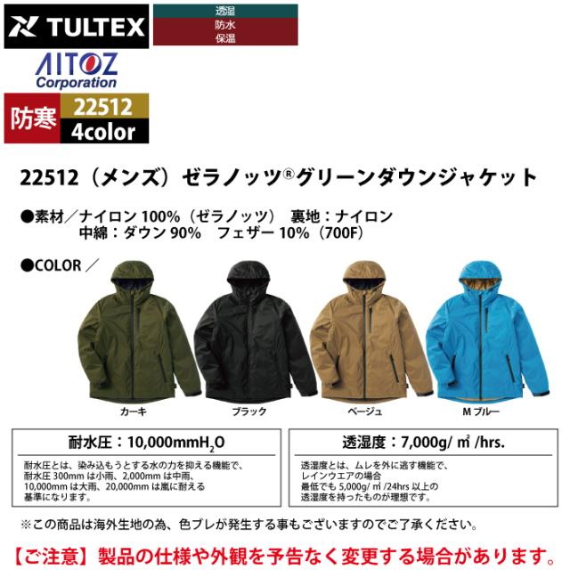 アウトドア 秋冬用 アイトス Aitoz 22512 ゼラノッツグリーンダウンジャケット(メンズ) M-3L