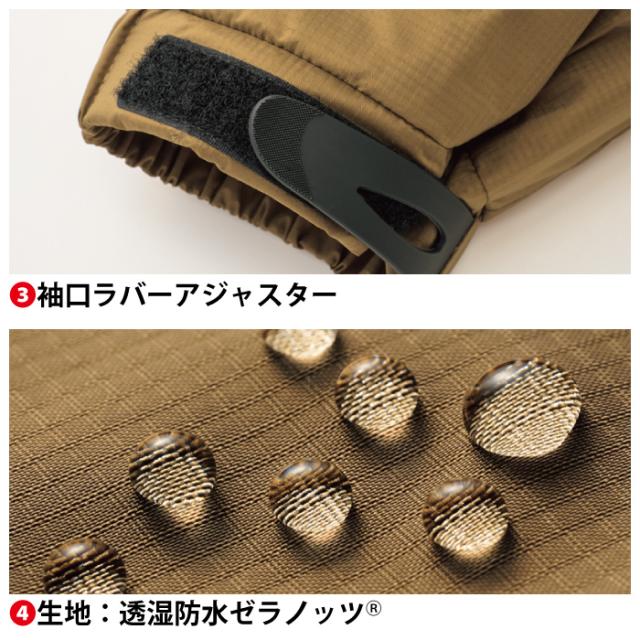 ◇機能:透湿・防水・保温・耐水圧:10 000mmH2O・透湿度:7 000g/m2/hrs.・止水ファスナー(左胸ポケット)・止水ファスナー(脇ポケット)・袖口ラバーアジャスター・生地:透湿防水ゼラノッツ(R)・止水ファスナーとWスライダー(フロント)・裏地側:グリーンダウン織ネーム