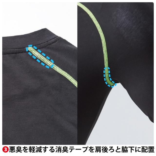 ◇機能:接触冷感・フリーストレッチ・UVカット・伸縮性に優れ動きやすいフリーストレッチ素材・肌触り良く快適な着心地のフラットシーム加工・悪臭を軽減する消臭テープを肩後ろと脇下に配置
