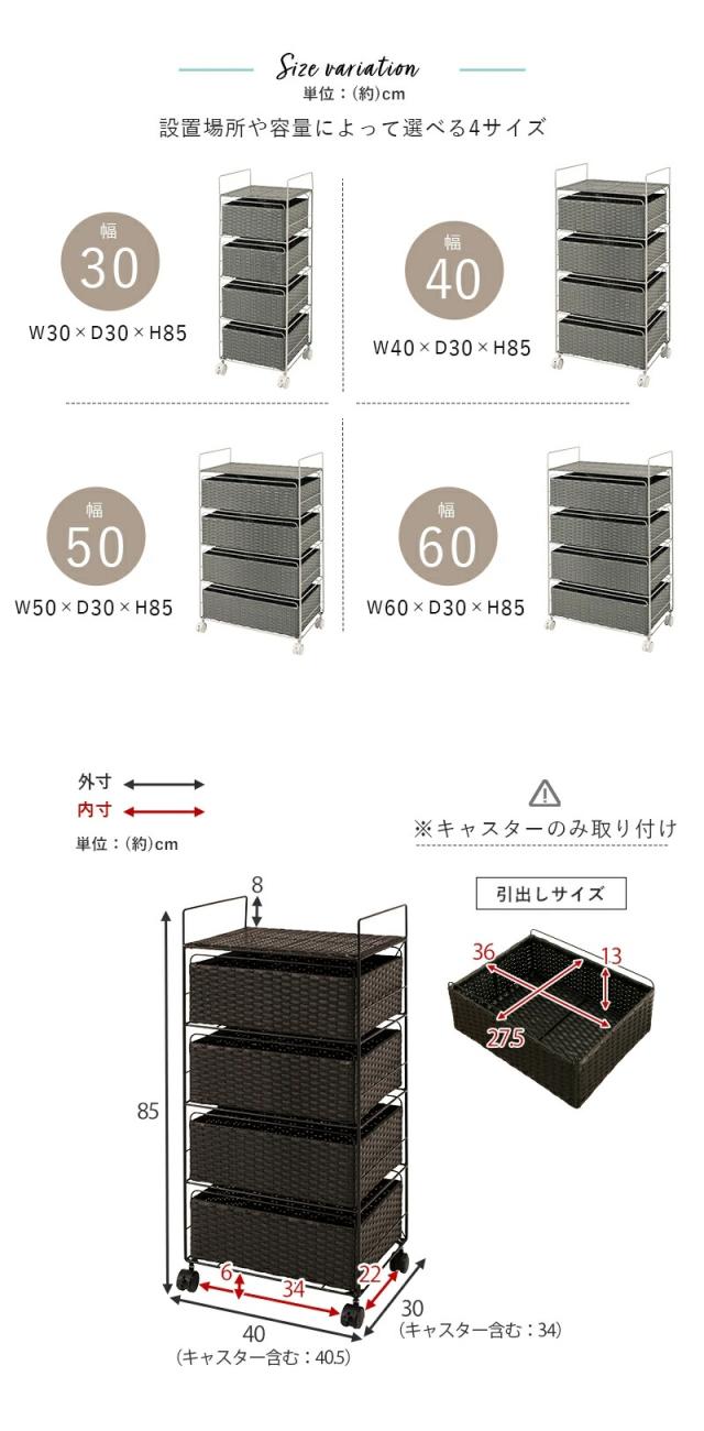 サイズは幅30・40・50・60cmの4サイズ。奥行と高さは共通なので幅サイズ違いを並べても使えます。クローゼット内はもちろん、リビングチェストとしても。見せてもおしゃれなチェストワゴンです。