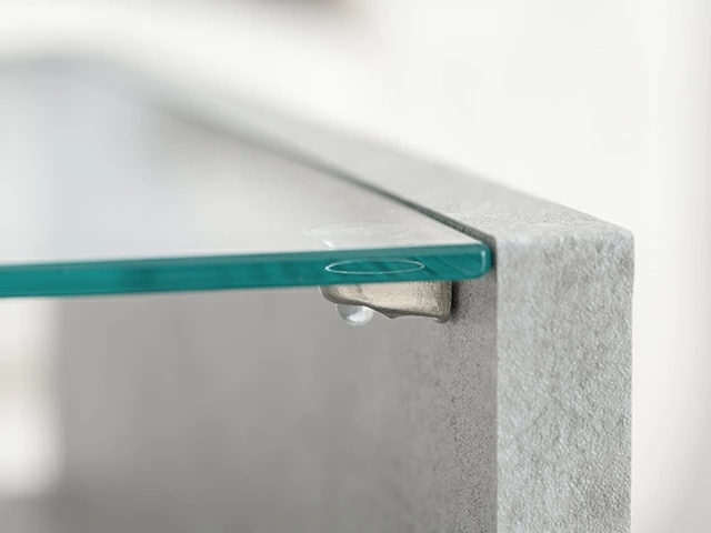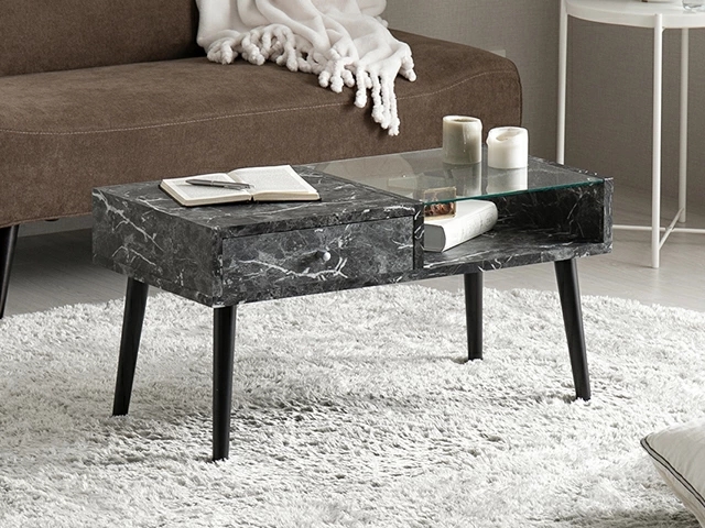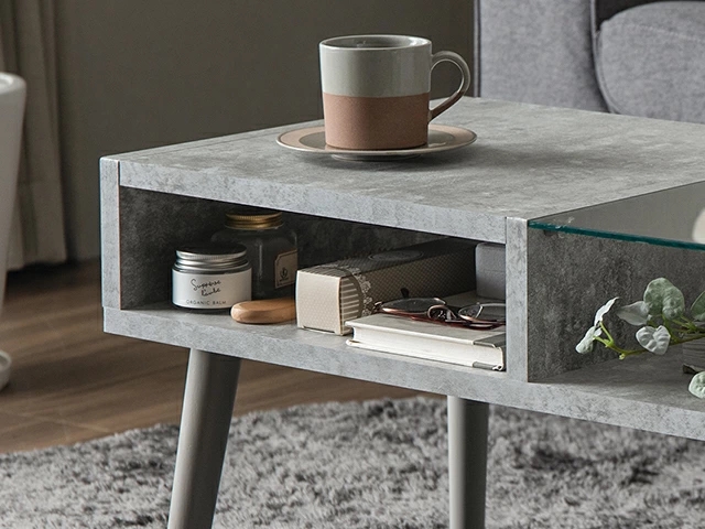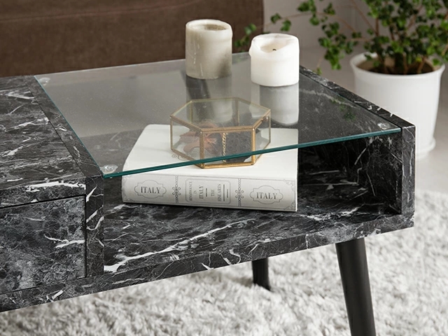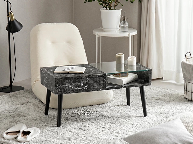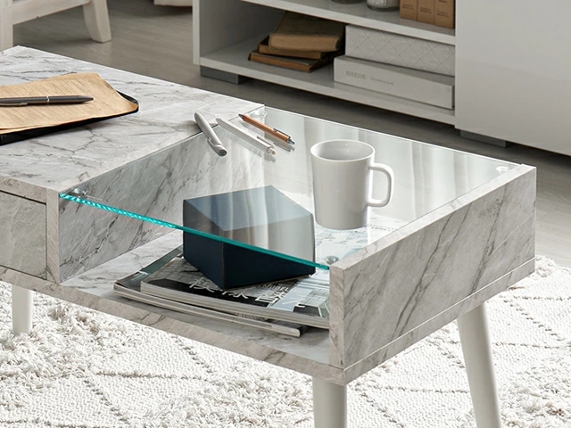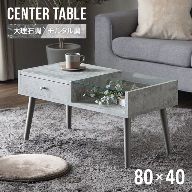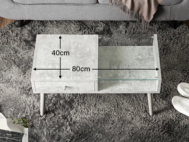 高級感漂う大理石調やモルタル調に抜け感のあるガラス天板を組み合わせたセンターテーブル。便利な引き出し収納とオープンスペースを備え、機能性にも長けた使い勝手の良い一台です。