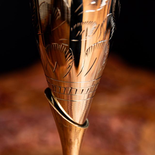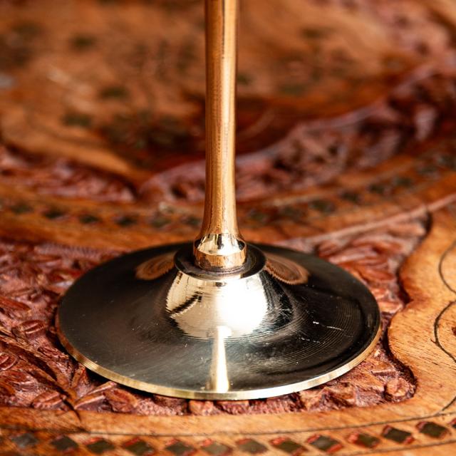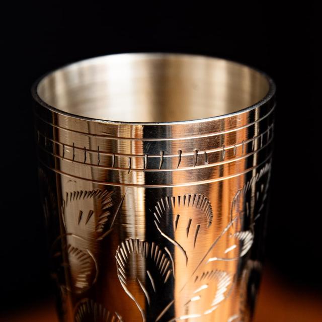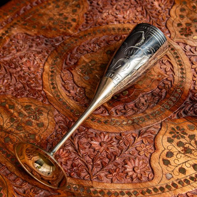 彫り込まれている細かな模様こそネパール・インドで良く見られるものですが、造形はアジア圏とは思えないほど洗練されています。スマートなシルエットがカッコよくて買付班もカトマンドゥで出会って一目惚れしてしまいました。ダルバートともにこんなグラスで飲み物がサーブされたら…想像するだけでワクワクしてしまいますね!カップ部分と脚部分はネジ式になっているので収納も便利なのがワンポイントです。長く手元に置けるテーブルウェアとしてどうぞ。