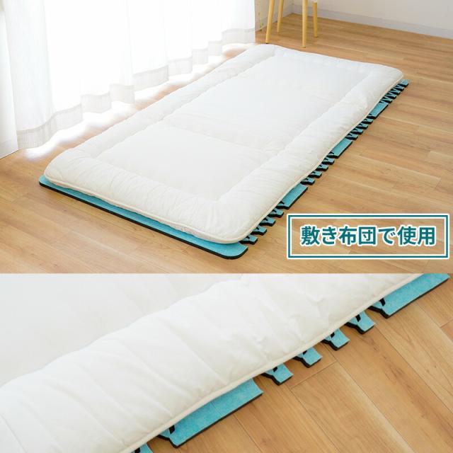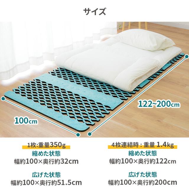 | ・アレルキャッチャー(R) 抗菌防臭・アレル物質対策 アレルキャッチャーは医療レヘルで高い安全性が認められた抗アレル物質・抗菌防臭素材です。 ※アレルギー症状の軽減を保証するものではありません。 ・高吸放湿繊維インエグジット(R)従来品にはなかった防ダニ効果と表裏両面への抗菌防臭効果を新しく加え、メーカー史上最もクリーンな使い心地を実現 ・じゃばら式すのこ型の優れた通気性工アージョブのシートは、じゃばら式で開くと通気孔が多数あるため、高い通気性を発揮! 風通しの良い場所で陰干しすると、吸湿力が復活します。 伸縮可能で広げて4枚連結するとシングしサイズにびったり。軽量で取り扱いが楽なので、誰でも簡単に組み立てられます。 真ん中の黒い層はポリエチレンフォームで、断熱性とクッション性あり。 | |