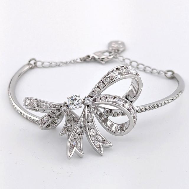 スワロフスキー 『 Hard Volta Bracelet Silver Bow Crystal Bracelet』です。バングル自体にはクリア・クリスタルのパヴェが施され、中央のリボンのデザインにはシャトナージュ技法を使ってさらに多くのクリア・ストーンがエレガントに飾られています。このロジウム・プレーティングのジュエリーでエレガンスを演出したりギフトとして贈ったりするのにもおすすめです。
